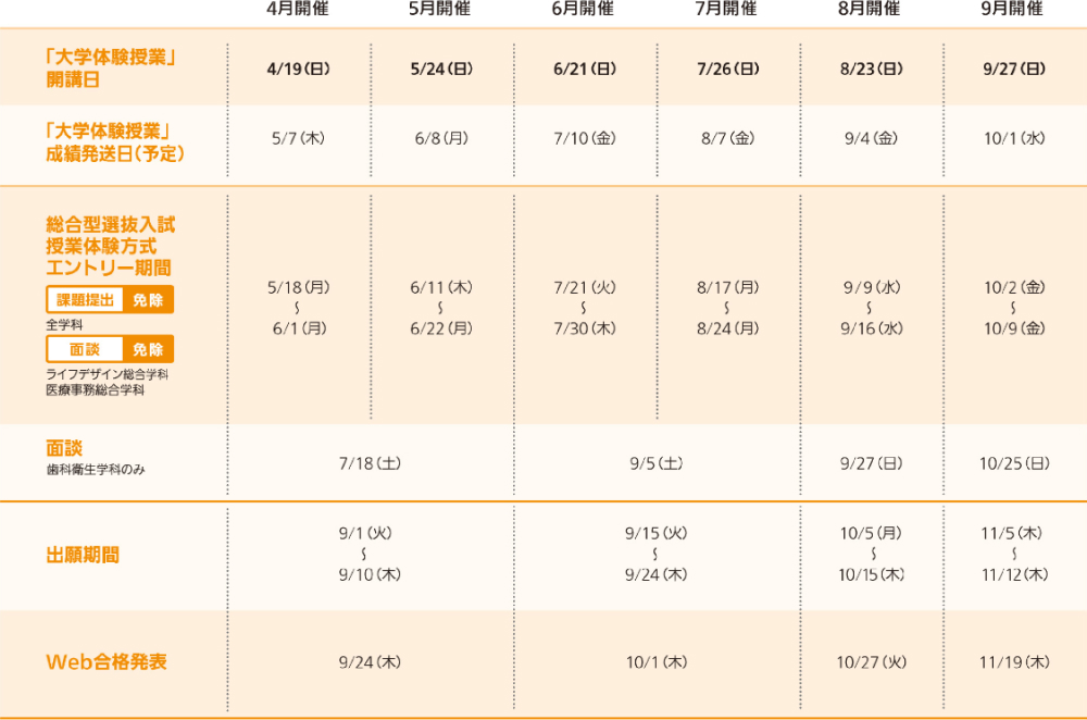 「総合型選抜入試 授業体験方式」の出願資格を取得するためには 2026年度大学体験授業に受講された高校3年生が対象です。受講された月に該当するエントリー期間にエントリーを行い、その後出願期間内に出願をしてください。歯科衛生学科はエントリー後「面談」を行います。 大学体験授業の成績、エントリー内容、面談※、および調査書の全体の学習成績の状況(旧:全体評定平均値)により総合的に合否判定を行います。大学体験授業の成績は、授業中に行われる理解度チェックの結果(筆記、作品制作、発表など)、授業態度などにより評価します。 ※歯科衛生学科のみ