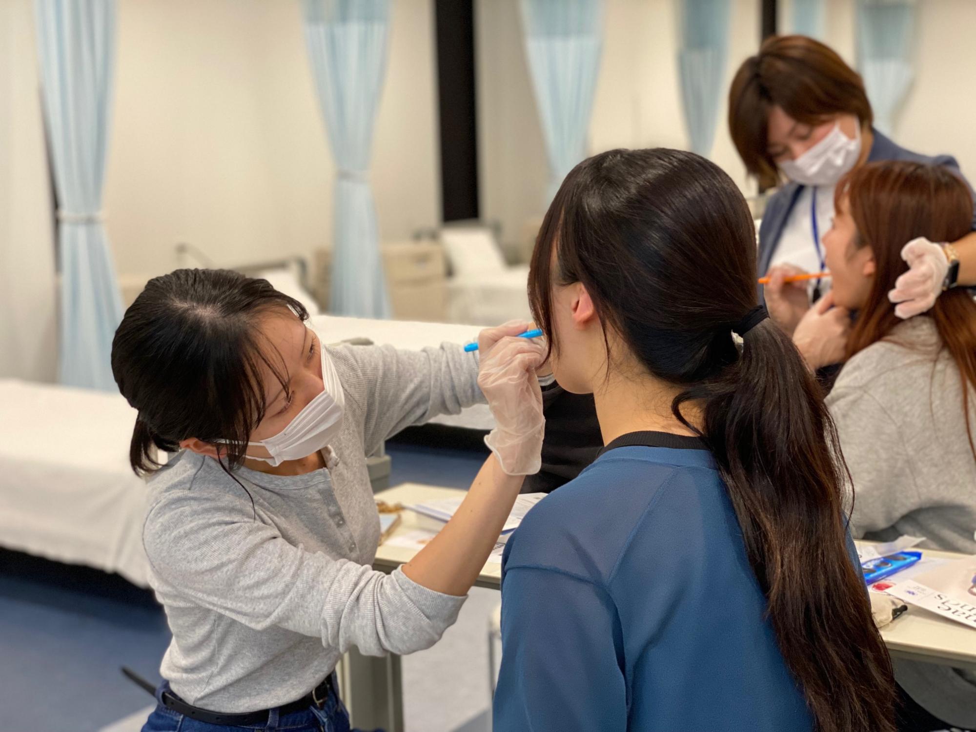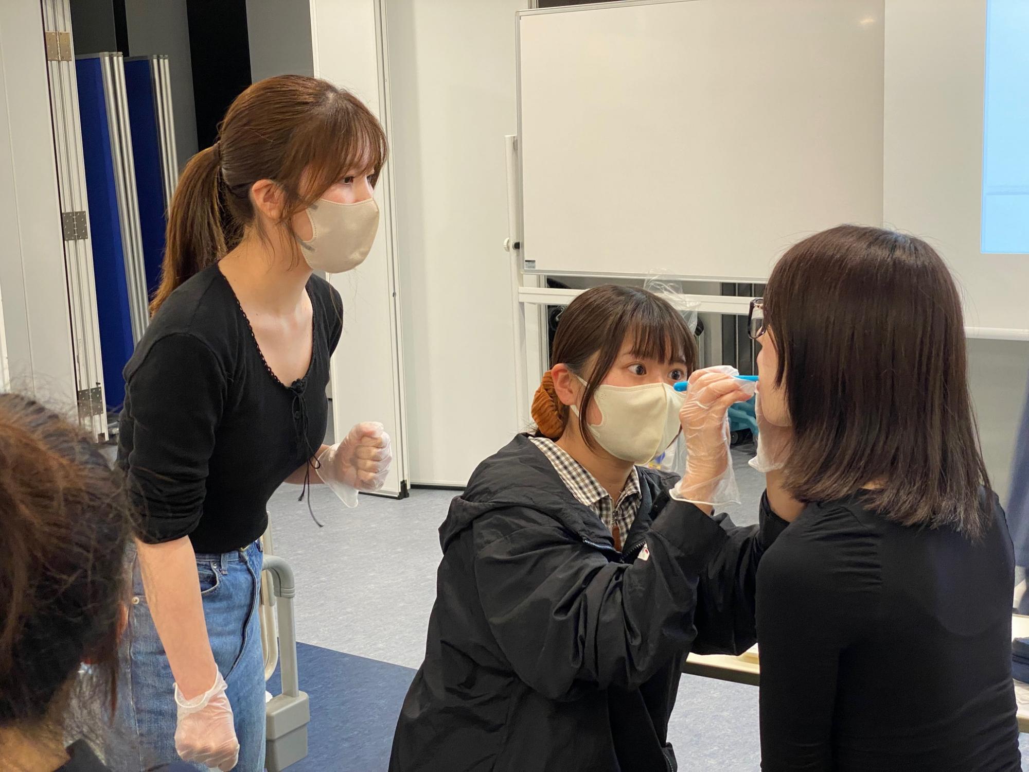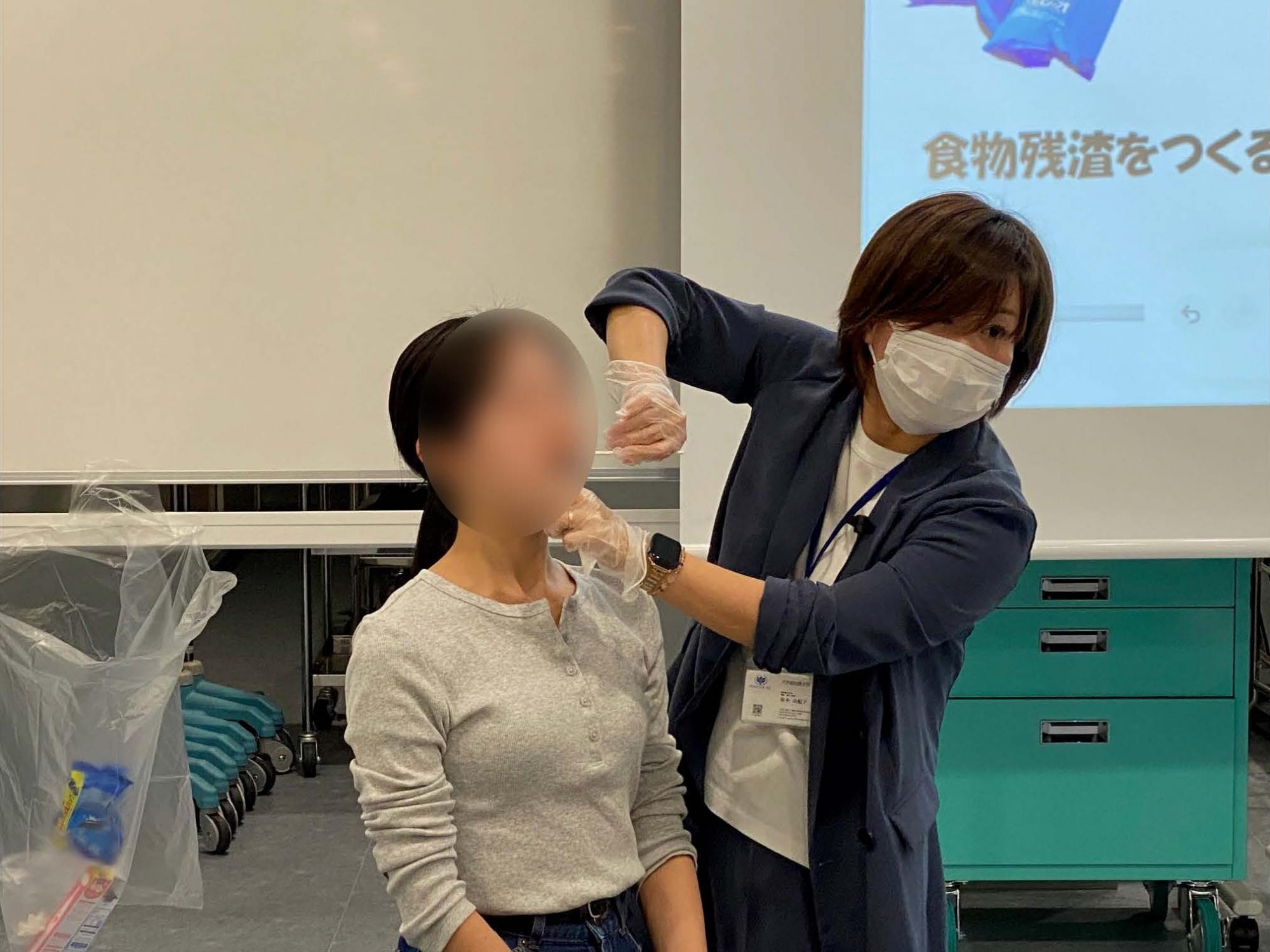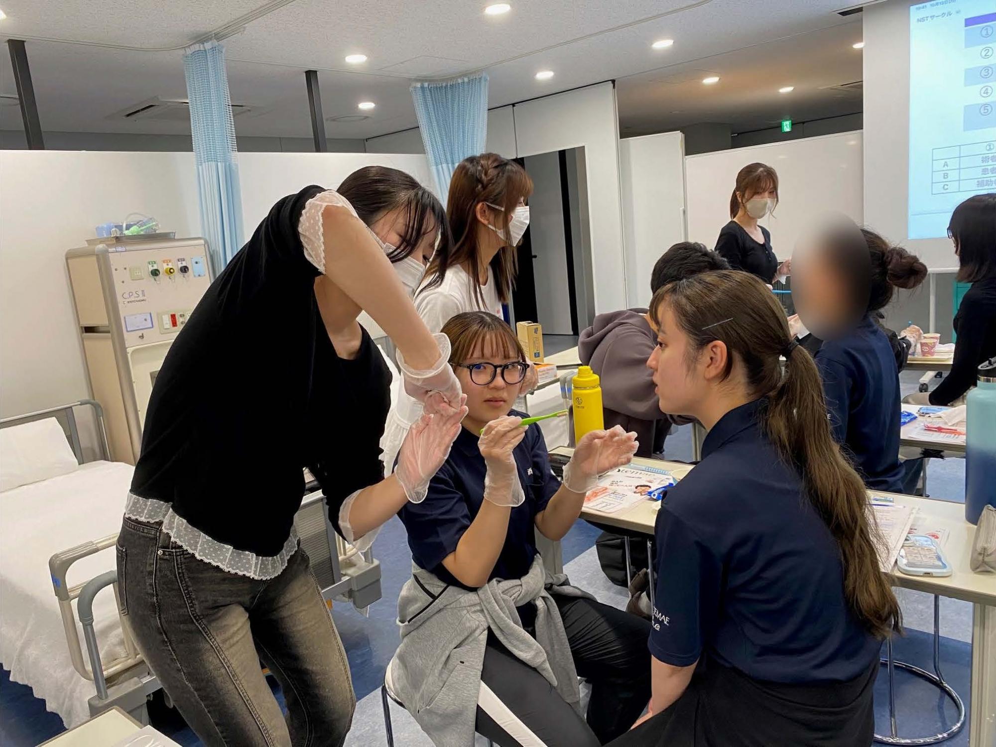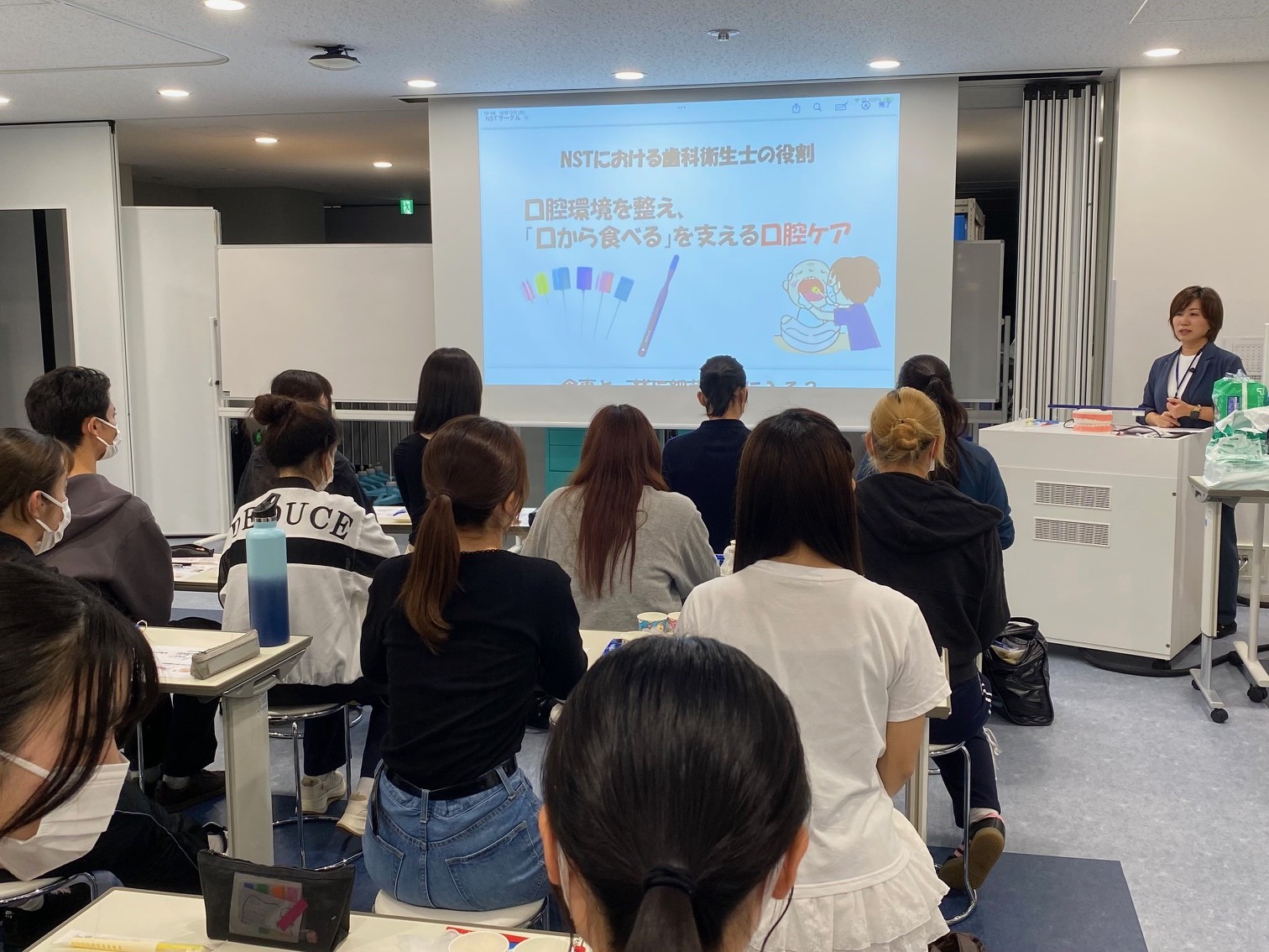 10月13日、本学で活動するNSTクラブが口腔ケア実習を実施しました。6月に発足し、10月に「クラブ」へと昇格したNSTクラブにとって、今回が昇格後初の活動となりました。今回は、歯科衛生学科の坂本由紀子講師が、口腔ケアの重要性に関する講義と実習を実施。坂本講師は、歯科衛生士としてNST(栄養サポートチーム)の一員としても活躍された経験をお持ちで、現場での体験談を交えた講義は、学生たちにとって大変興味深い学びの時間となりました。実習では、大手前大学の健康栄養学部、国際看護学部、そして歯科衛生学科の学生が混合でグループを編成し、「術者」「患者」「補助者」の3つの役割を交代で体験。歯科衛生学科の学生がはじめて口腔ケアの術者を体験する健康栄養学部・国際看護学部の学生のサポート役を担ってくれました。ブラシの使い方や誤飲を防ぐための顔の角度への配慮など、病院現場を想定した実践的な内容に、初めて口腔ケアを行う学部生たちは緊張しながらも真剣に取り組みました。NSTクラブ代表である健康栄養学部3年・藤原明音さんは「授業では学べない歯ブラシやう蝕(しょく)予防、口腔ケアの重要性について学び、実際に学生同士でブラッシングや口腔粘膜清掃を体験しました。初めてで難しく感じました、坂本先生や歯科衛生学科のメンバーのアドバイスを受けながら、声かけやブラッシングのポイントも意識して実習ができました。」と感想を述べていました。また、歯科衛生学科2年・石井沙苗さんは「歯科衛生学科ではないメンバーと口腔ケアの実習することは初めての事だったので、最初は少し緊張しましたが、“補助者”として歯ブラシやスポンジブラシの使い方、当て方、圧のかけ方などをアドバイスしたり、術者として実際に口腔ケアをさせていただいて、またひとつ経験を積めたことがとても嬉しかったです。また、健康栄養学部、国際看護学部の方とコミュニケーションをとりながら楽しく実習をする事ができ、このような機会をいただけたことにとても感謝しています。」と振り返っていました。今回の実習は、短大1学科(歯科衛生学科)と大学2学部(健康栄養学部・国際看護学部)が学園内で連携し、それぞれの専門性を活かしながら学び合う、非常に貴重な取り組みとなりました。職種の垣根を越えた学びの場が、今後のチーム医療の現場での協働に活かされることが期待されます。今後もNSTクラブでは、多職種連携をテーマとした学びの機会を積極的に展開していく予定です。