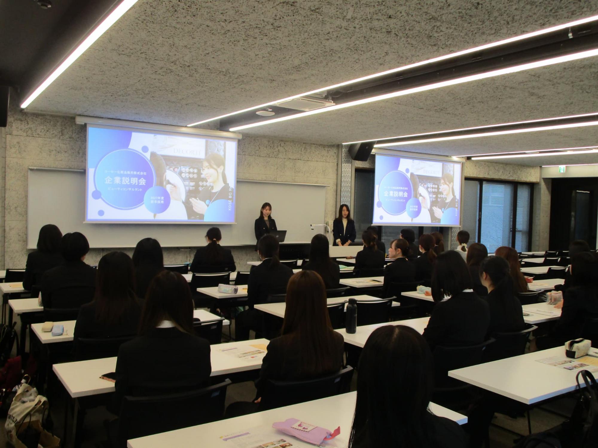 10月30日、お仕事発見セミナー(ブライダル & ビューティーコンサルタント)を開催しました。第3回目となる今回は、ブライダル業界から株式会社レック、ビューティーコンサルタントのお仕事説明として、コーセー化粧品販売株式会社の方々をお招きして実施いたしました。株式会社レックからは、大手前短期大学の卒業生にも参加していただき、ブライダルの世界で活躍している先輩からのお話しに刺激を受けていました。また、コーセー化粧品販売株式会社からは、ビューティーコンサルタントは、「その人の魅力を引き出すお仕事」、「お客様を輝かせながら、自分も輝けるお仕事」とのお話しをいただき、学生からは「人をきれいする仕事はとても魅力的だと改めて感じた」などの感想が寄せられました。お仕事発見セミナーは、これから就職活動をスタートする短期大学1年生へ向けて企業人事担当者より仕事についてお話をしていただくことにより、働くイメージを広げていくことを目的に実施しているイベントです。先週から引きつづいて木曜日に実施しています。
