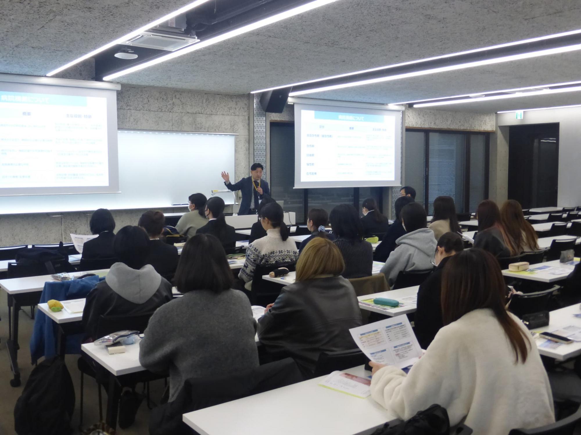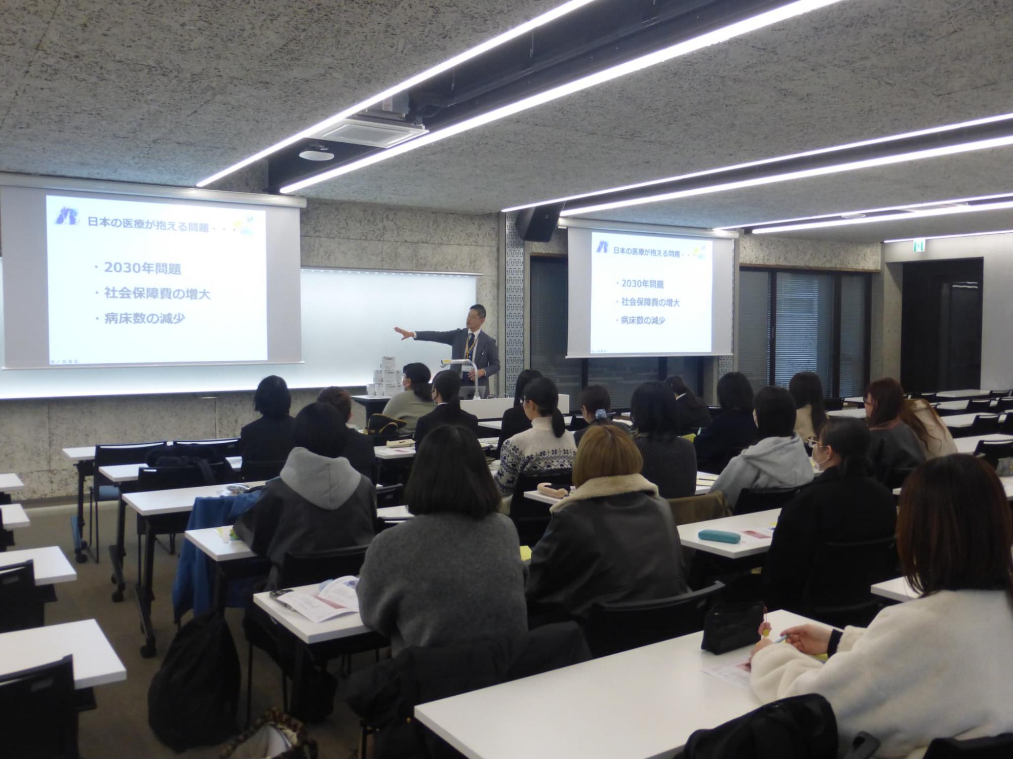 11月27日、「お仕事発見セミナー(医療事務のお仕事 その2)」を開催しました。第6回となる今回は、医療事務職のお仕事について、アルカグループ(株式会社アルカ・株式会社ナガタ薬品)、社会医療法人 渡邊高記念会 西宮渡辺病院にお越しいただき、お話を伺いました。アルカグループからは、冒頭で「白衣を着る責任」という言葉をご紹介いただき、医療職として働くことの意味と責任についてお話いただきました。また、西宮渡辺病院からは、病院とクリニックの違いや医療分野における規制の問題、医療を取り巻く社会の動きなどをご紹介いただき、学生の視野を広げる機会となりました。両者のお話を聞き比べることで、それぞれの特徴や求められるものの違いを学ぶ貴重な時間となりました。「お仕事発見セミナー」は、これから就職活動をスタートする短期大学1年生を対象に、企業の人事担当者から仕事について直接お話を伺うことで、働くイメージを広げることを目的としたイベントです。原則、木曜日に実施しています。