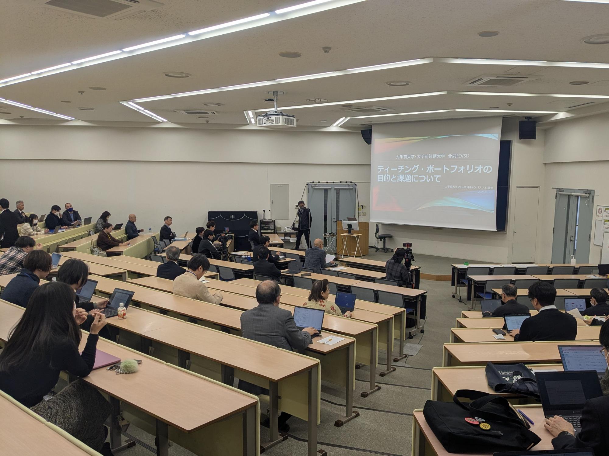 1月27日、大手前大学FD委員会、大手前短期大学FD委員会は、合同で公開FD・SDセミナー「ティーチング・ポートフォリオの目的と課題について」を開催しました。本セミナーは、ティーチング・ポートフォリオにおけるこれまでの本学の取り組みや、今後の課題について情報共有し、今後の授業改善の参考にすることを目的として開催され、ティーチング・ポートフォリオの定義とその活用について講演があり、大学と短期大学から4つの事例紹介が行われました。当日は、大手前学園教職員、一般社団法人大学コンソーシアムひょうご神戸加盟校の教職員の合計71名にご参加いただきました。