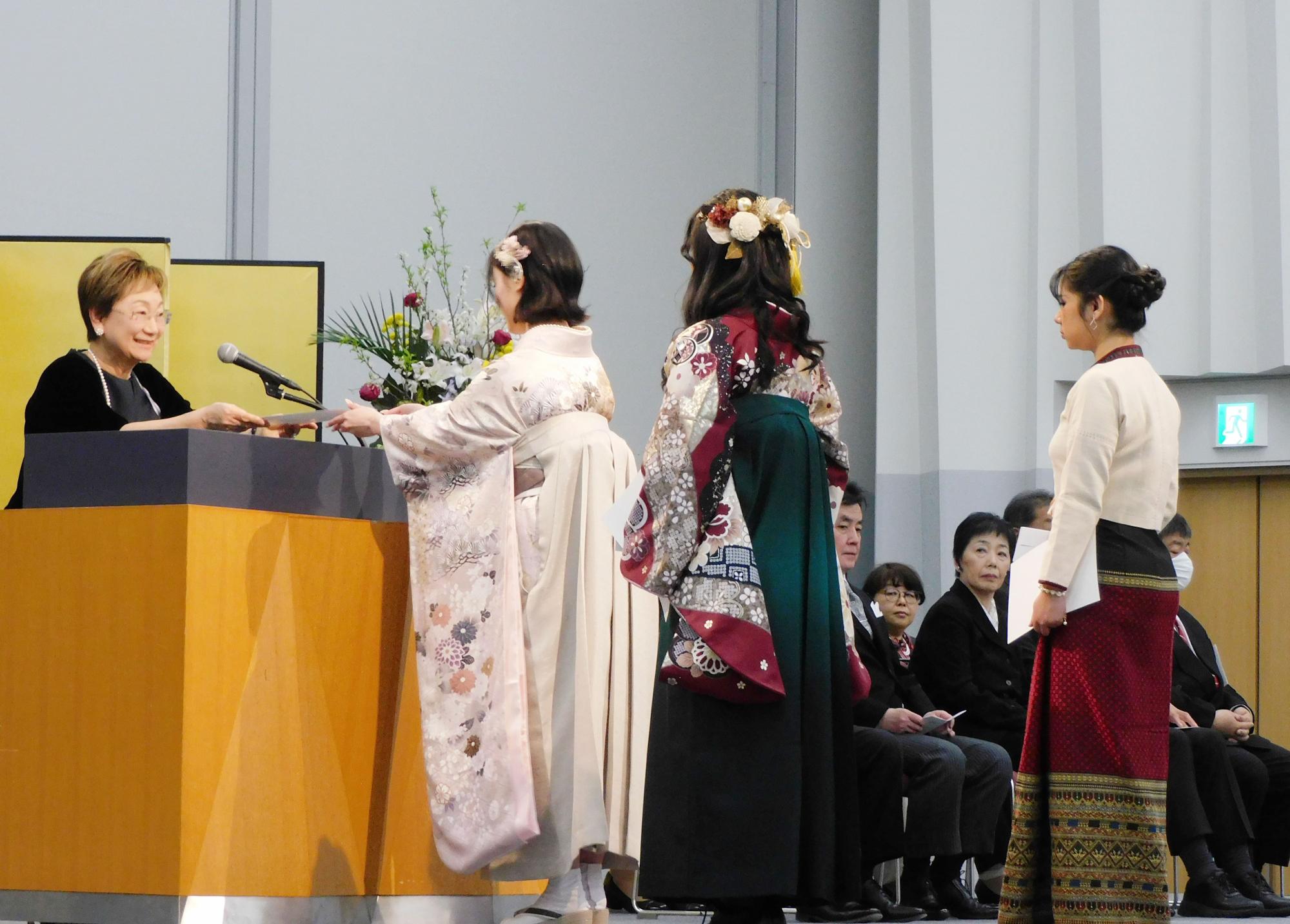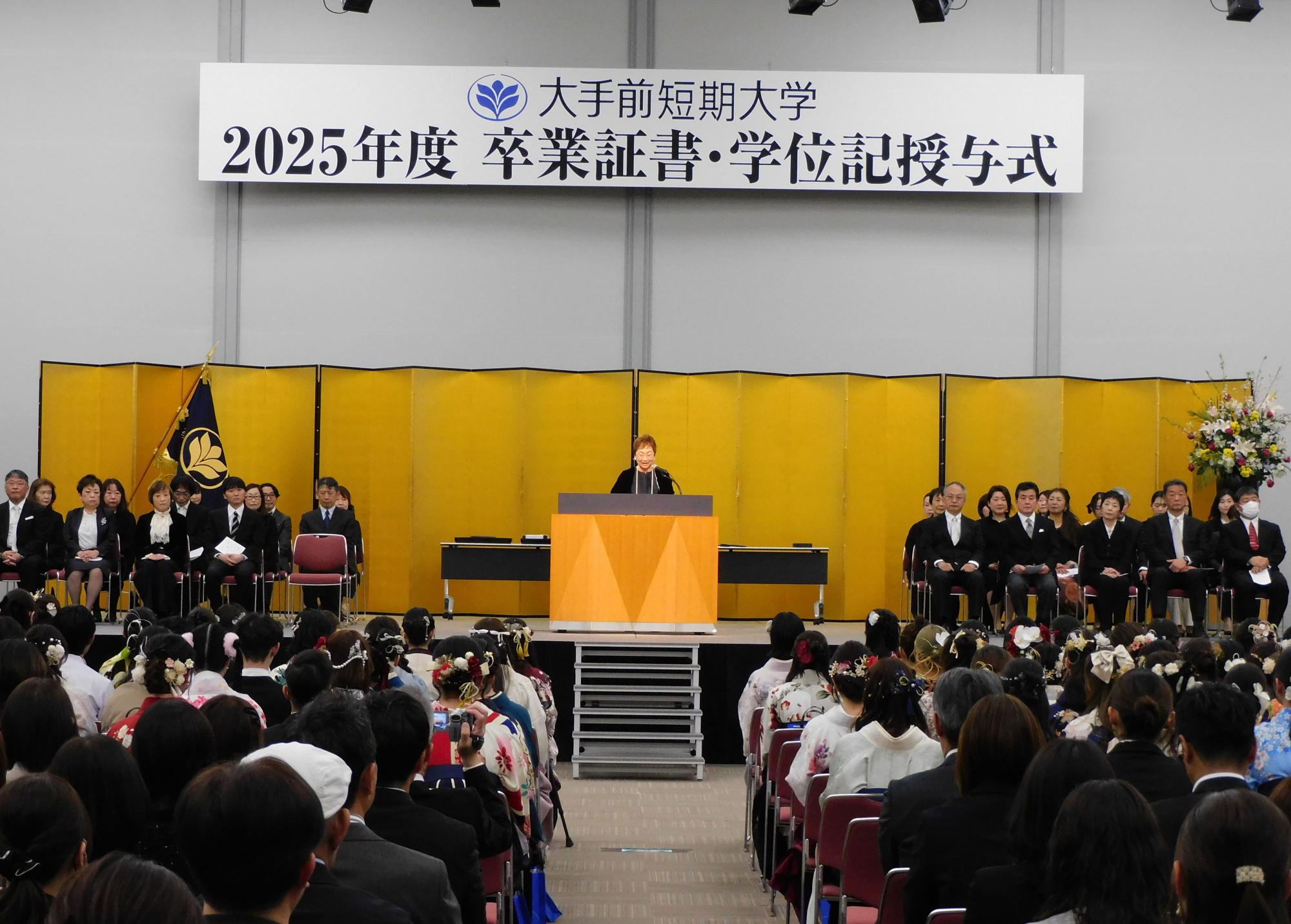 3月18日、大阪国際会議場「グランキューブ大阪」にて、大手前短期大学 卒業証書・学位記授与式を執り行いました。式典では、代表者への卒業証書・学位記の授与に加え、理事長賞・学長賞・成績優等賞・日本歯科衛生士会と兵庫県歯科衛生士会の学生会員会長賞・学生功労賞などが授与されました。式典終了後は、各担当教員より卒業証書が全員に直接手渡しされ、学生たちは、教員やゼミ生同士で記念撮影を楽しんでいました。また、当日の会場の様子はYouTube限定ライブ配信を行い、来場が叶わなかった卒業生やご家族の皆さまにもご覧いただきました。185名の卒業生たちはそれぞれの新たな道を歩み出しました。卒業生の皆さまご卒業おめでとうございます!